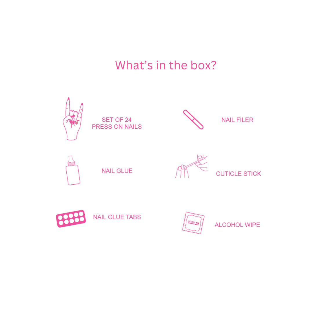 The kit includes 24 fake nails, glue tabs, alcohol wipe, manicure stick, nail glue and mini nail file.