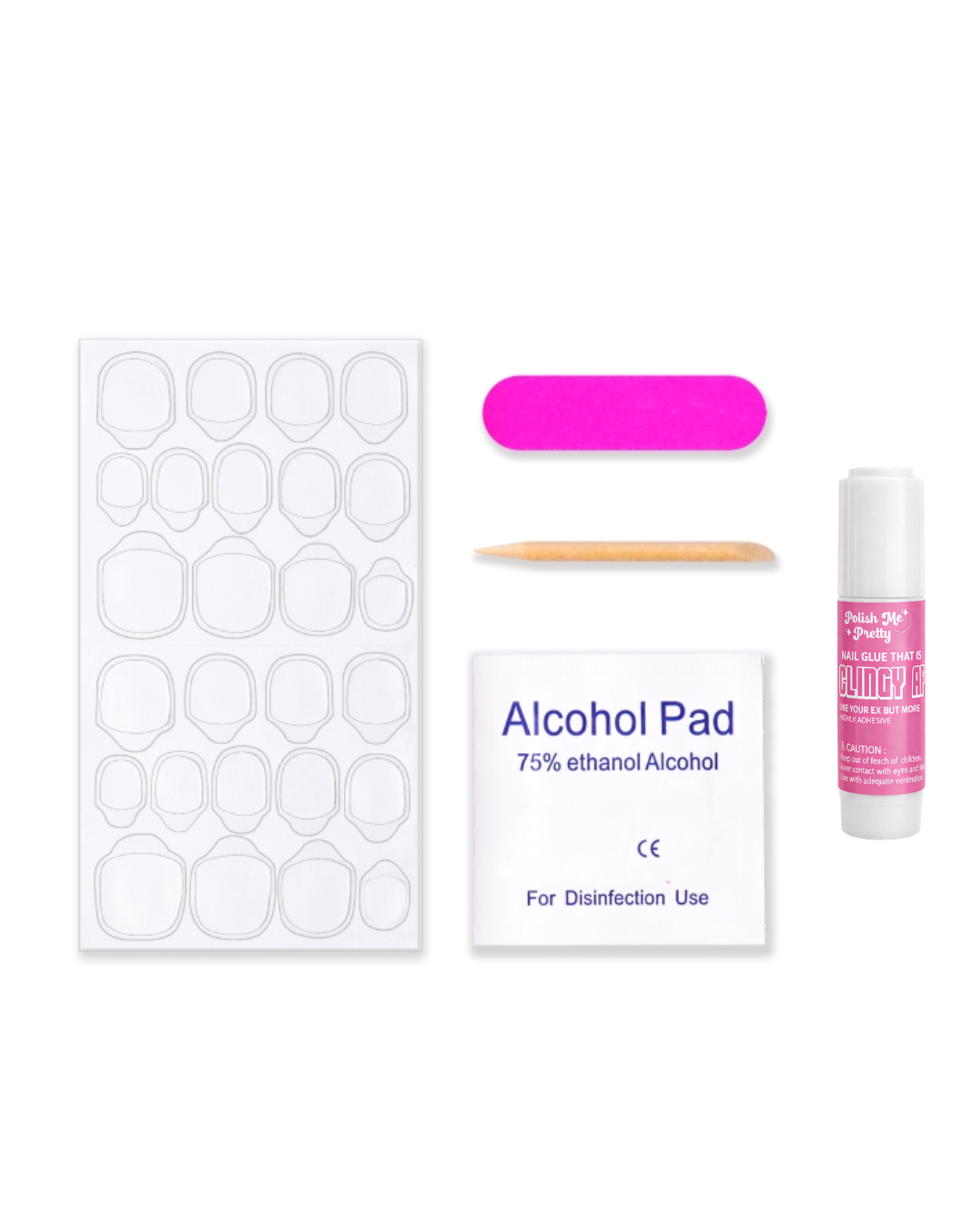The kit includes 24 fake nails, glue tabs, alcohol wipe, manicure stick, nail glue and mini nail file