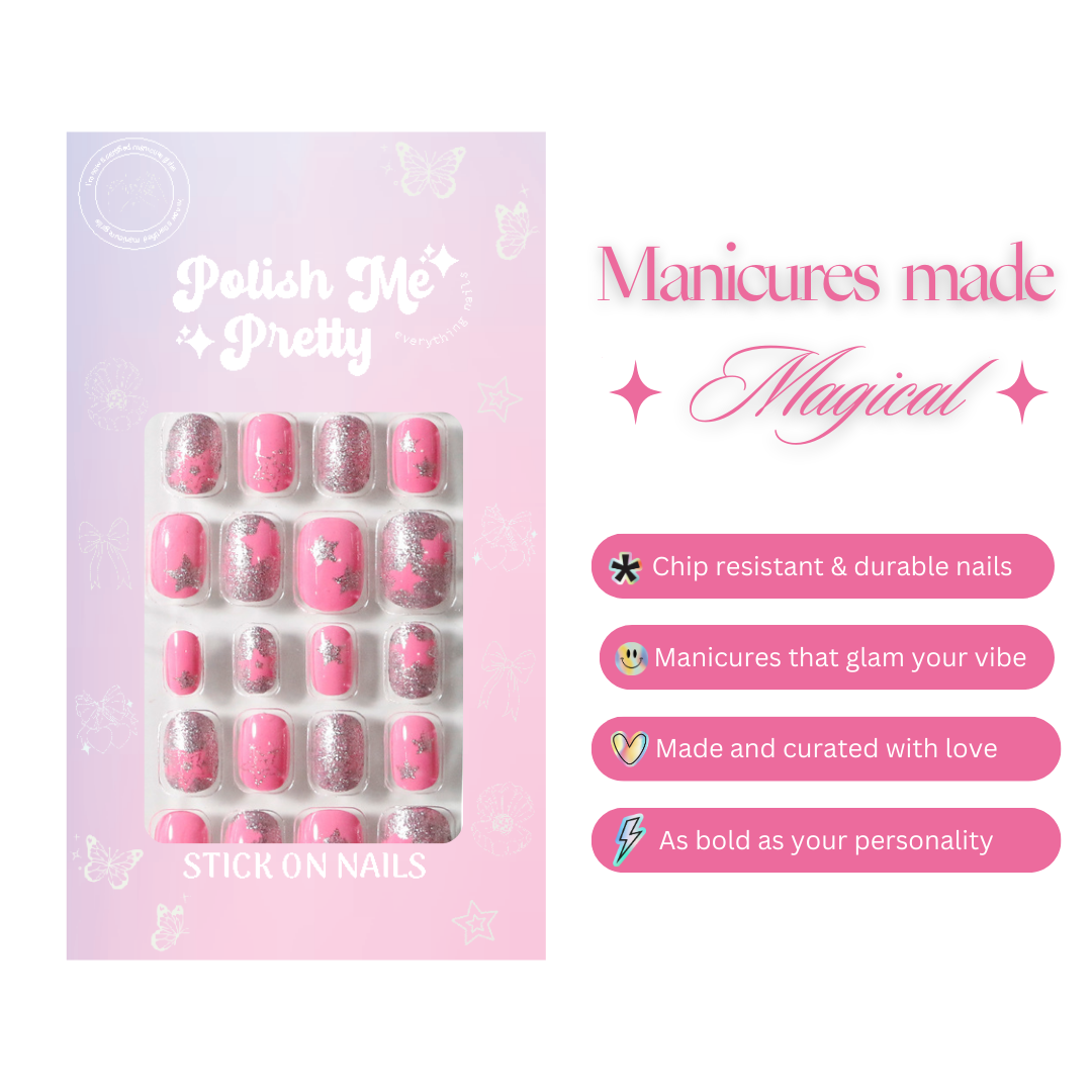 From glittery pinks with stars to playful patterns, our press-on nails come in a variety of colours and designs that kids adore. It’s like having a mini fashion show at their fingertips!