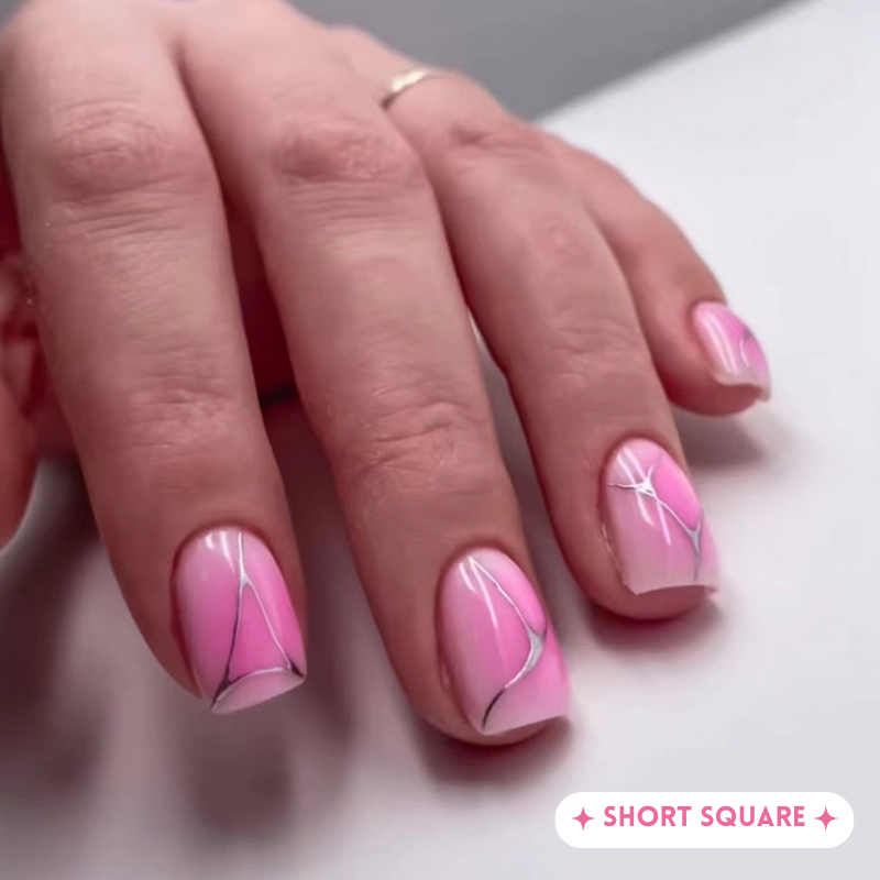 Pink Battle is a ombre pink square short manicure with silver streak accents